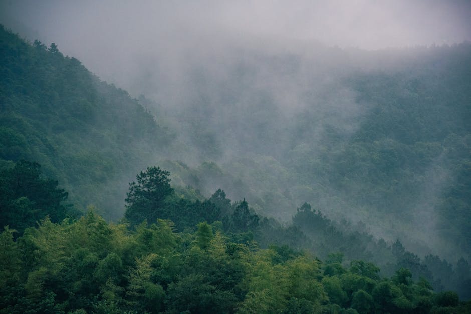 Forest Nature – A serene view of a mist-covered forest on a moun #167699