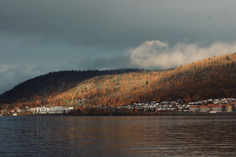 Lake Reflections – A scenic view of Jönköping’s hillside with autum #19068033